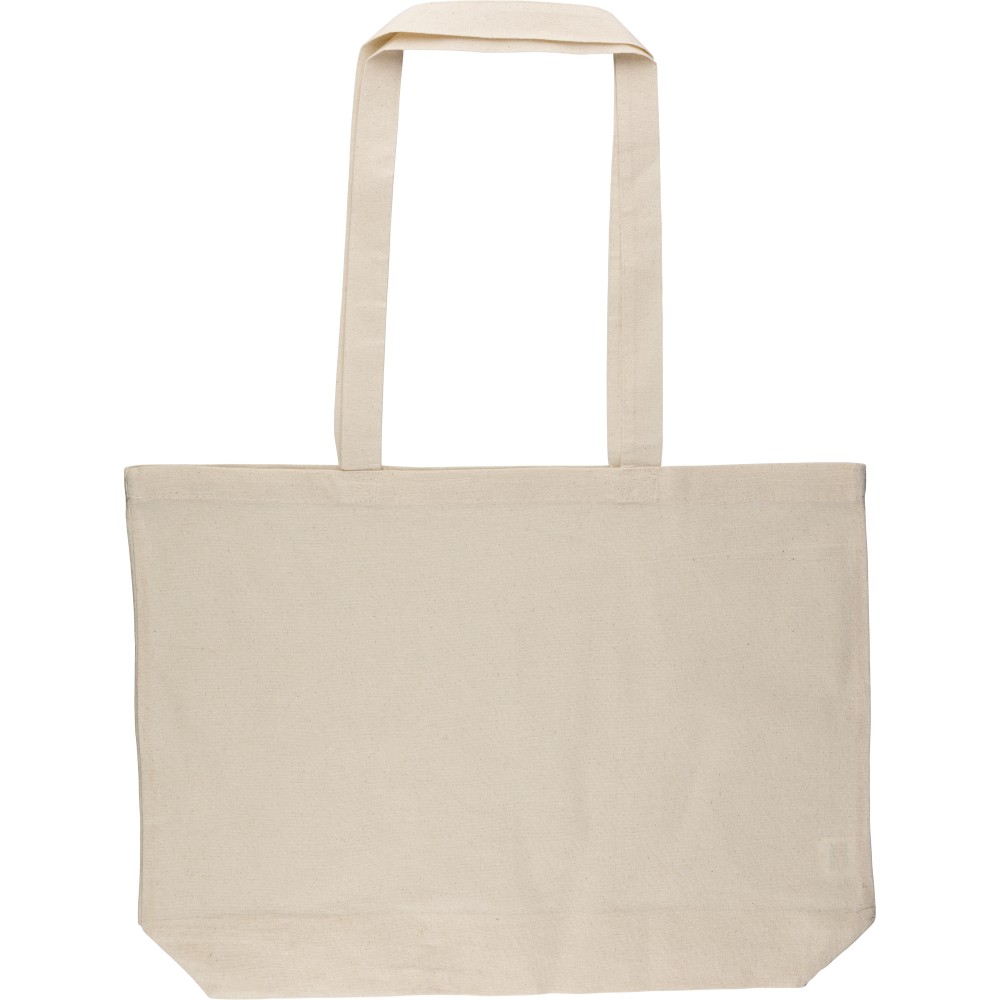 Oeko-Tex minősítésű, 140 g/m2 pamutból készült natúr színű bevásárlótáska, 48 × 34 × 10 cm méretben, 70 cm hosszúságú és 2,5 cm szélességű fülekkel. Oeko-Tex címkével ellátva.