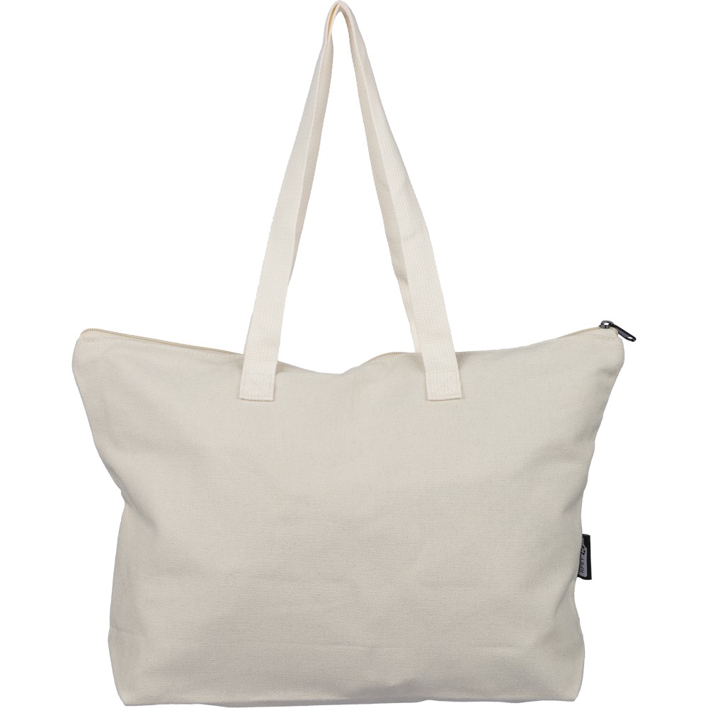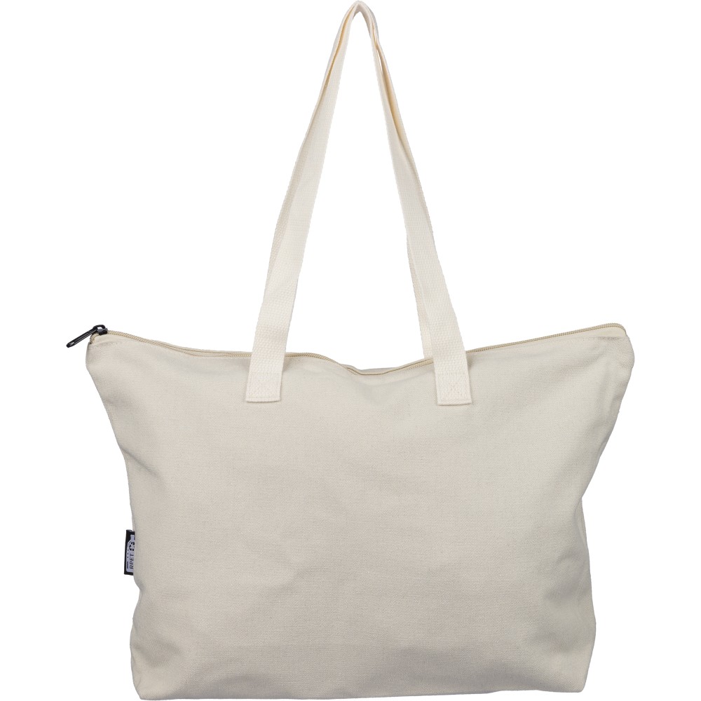 Újrahasznosított pamut-poliészter, 330 g/m2 kevertszövetből készült bevásárlótáska nagy, cipzáras felső rekesszel, 65 cm hosszúságú és 2,5 cm szélességű hosszú fülekkel, a táska színével harmonizáló hevederrel. Külső felületén rPET címkével, belső részén további címkével ellátva.