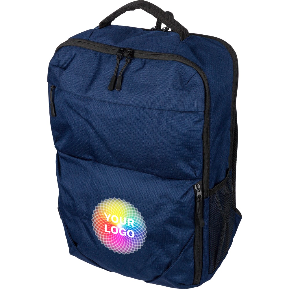 RPET 300D Ocean Bound anyagból készült hátizsák, amely újrahasznosított óceáni műanyagból készül, tartós és texturált felületű kialakítással. 20 literes űrtartalommal rendelkezik, két nagy cipzáras rekesszel, párnázott 15 hüvelykes laptoprekesszel, két elülső zsebbel, hálós oldalzsebbel és felső fogantyúval. Szellőző vállpántokkal, párnázott hátoldallal és bőröndre rögzíthető pánttal ellátva, a terméken Ocean Bound Plastic alapanyagra utaló címke található.