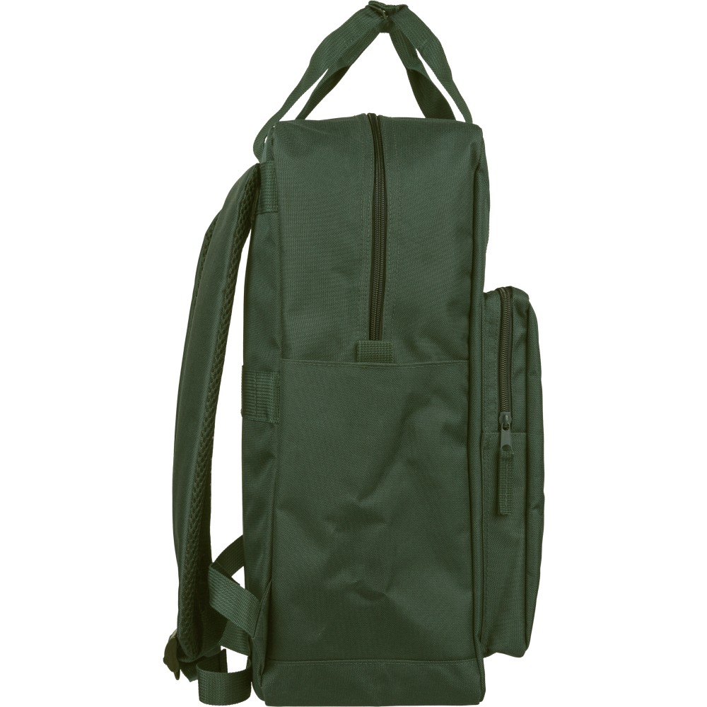 Újrahasznosított 900D poliészterből készült hátizsák, 210D béléssel és rPET címkével. Tágas fő rekesszel rendelkezik, 16?-os laptop számára kialakított külön zsebbel, elülső rekesszel, két oldalzsebbel, valamint bőröndre rögzíthető pánttal (trolley strap). Felső fogantyúi gombbal összefoghatóak, vállpántjai szellőző kialakításúak a kényelmes viselet érdekében.