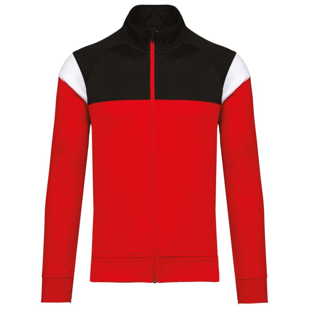 Anyaga: 100% matt poliészter interlock. Egyenes szabás. Elöl fordított cipzáras záródás színazonos nejlonból. Raglán ujjak kontrasztos vállbetétekkel. Kontrasztos mell- és vállkialakítás. Két cipzáras elülső zseb. Texturált anyagbetétek az oldalakon és a hátrészen. Cipzárfedő a felső nyakkivágásnál a nagyobb kényelem érdekében. Könnyen eltávolítható márkajelzés a dekorációhoz.